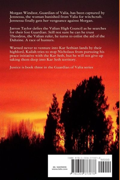 Morgan Windsor, Guardian of Valia, has been captured by Jennessa, the woman banished from Valia for witchcraft. Jennessa finally gets her vengeance against Morgan. Jarron Taylor defies the Valian High Council as he searches for their lost Guardian. Still not sure he can he trust Theodros, the Valian ruler, he turns to enlist the aid of the Dahzine. A race of hunters. Warned never to venture into Kar Sethian lands by their highlord, Kailah tries to stop Nicholaus from pursuing his peace initiative with the Kar Seth, but he will not give up taking them deep into Kar Seth territory. Justice is book three in the Guardian of Valia series.