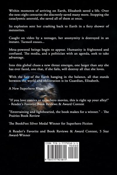 Within moments of arriving on Earth, Elizabeth saved a life. Over the next eight centuries she discretely saved many more. Stopping the cataclysmic asteroid, she saved them all. Its explosion sent her crashing back to Earth in a fiery shower of meteorites. Caught on video by a teenager, her anonymity is destroyed in an instant. Turmoil ensues... Meta-powered beings begin to appear. Humanity is frightened and confused. The media, and a politician with an agenda, seek to take advantage. Into this global chaos a new threat emerges, one greater than any she has ever faced, one that, if she fails, will destroy all that she loves. With the fate of the Earth hanging in the balance, all that stands between the world and obliteration is its Guardian, Elizabeth. A New Superhero Rises...