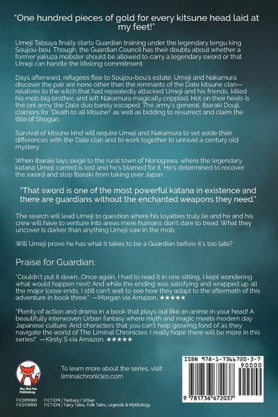 "One hundred pieces of gold for every kitsune head laid at my feet!" Umeji Tatsuya finally starts Guardian training under the legendary tengu king Soujou-bou. Though, the Guardian Council has their doubts about whether a former yakuza mobster should be allowed to carry a legendary sword or that Umeji can handle the lifelong commitment. Days afterward, refugees flee to Soujou-bou's estate. Umeji and Nakamura discover the pair are none other than the remnants of the Date kitsune clan-relatives to the witch that had repeatedly attacked Umeji and his friends, killed his mob big brother, and left Nakamura magically crippled. Hot on their heels is the oni army the Date duo barely escaped. The army's general, Ibaraki Douji, clamors for 'Death to all kitsune!' as well as bidding to resurrect and claim the title of Shogun. Survival of kitsune kind will require Umeji and Nakamura to set aside their differences with the Date clan and to work together to unravel a century old mystery. When Ibaraki lays siege to the rural town of Nonogawa, where the legendary katana Umeji carried is lost and he's blamed for it. He's determined to recover the sword and stop Ibaraki from taking over Japan. The search will lead Umeji to question where his loyalties truly lie and he and his crew will have to venture into areas mere humans don't dare to tread. What they uncover is darker than anything Umeji saw in the mob. Will Umeji prove he has what it takes to be a Guardian before it's too late? Guardian is the second book in the Liminal Chronicles series. Order now to enjoy Umeji's action-packed journey into Japanese myth, personal redemption, and found family.