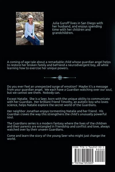 A coming-of-age tale about a remarkable child whose guardian angel helps to restore her broken family and befriend a neurodivergent boy, all while learning how to exercise her unique powers. Do you ever feel an unexpected surge of emotion? Maybe it's a message from your guardian angel. We each have a Guardian watching over our soul, but we cannot see them. Nobody can. Except Natalie. She is a Seer, born with the unique ability to communicate with her Guardian. Her brilliant friend Timothy, an autistic boy who loves science, helps Natalie explore the secret world of the Guardians. Her neighbor Jonathan enjoys tormenting Natalie and her friend. His Guardian craves the way this strengthens the child's unusually powerful soul. The Guardians series is a modern fantasy where the lives of the children and their parents are entangled in friendship and conflict and love, always watched over by their unseen Guardians. Come and learn the story of the young Seer who might just change the world.