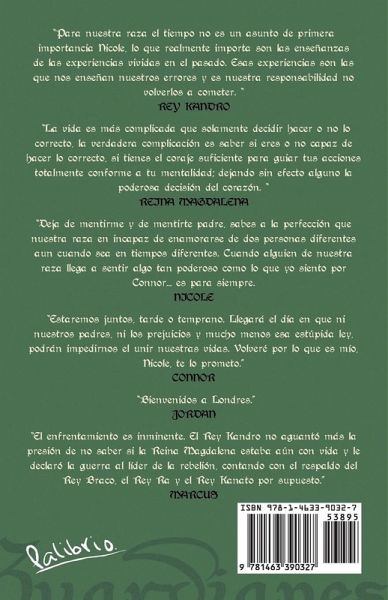 "Para nuestra raza el tiempo no es un asunto de primera importancia Nicole, lo que realmente importa son las enseñanzas de las experiencias vividas en el pasado. Esas experiencias son las que nos enseñan nuestros errores y es nuestra responsabilidad no volverlos a cometer. " REY KANDRO "La vida es más complicada que solamente decidir hacer o no lo correcto, la verdadera complicación es saber si eres o no capaz de hacer lo correcto, si tienes el coraje suficiente para guiar tus acciones totalmente conforme a tu mentalidad; dejando sin efecto alguno la poderosa decisión del corazón. " REINA MAGDALENA "Deja de mentirme y de mentirte padre, sabes a la perfección que nuestra raza en incapaz de enamorarse de dos personas diferentes aun cuando sea en tiempos diferentes. Cuando alguien de nuestra raza llega a sentir algo tan poderoso como lo que yo siento por Connor... es para siempre. NICOLE "Estaremos juntos, tarde o temprano. Llegará el día en que ni nuestros padres, ni los prejuicios y mucho menos esa estúpida ley, podrán impedirnos el unir nuestras vidas. Volveré por lo que es mío, Nicole, te lo prometo." CONNOR "Bienvenidos a Londres." JORDAN "El enfrentamiento es inminente. El Rey Kandro no aguantó más la presión de no saber si la Reina Magdalena estaba aún con vida y le declaró la guerra al líder de la rebelión, contando con el respaldo del Rey Braco, el Rey Ra y el Rey Kanato por supuesto." MARCUS