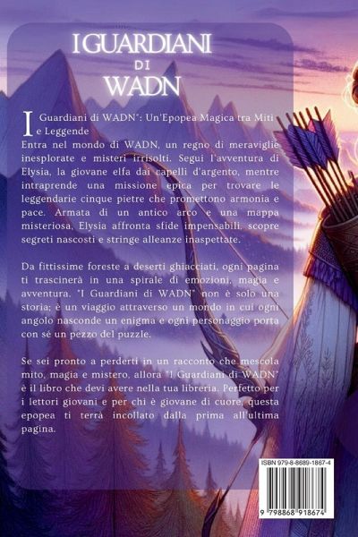 I Guardiani di WADN": Un'Epopea Magica tra Miti e Leggende. Entra nel mondo di WADN, un regno di meraviglie inesplorate e misteri irrisolti. Segui l'avventura di Elysia, la giovane elfa dai capelli d'argento, mentre intraprende una missione epica per trovare le leggendarie cinque pietre che promettono armonia e pace. Armata di un antico arco e una mappa misteriosa, Elysia affronta sfide impensabili, scopre segreti nascosti e stringe alleanze inaspettate. Da fittissime foreste a deserti ghiacciati, ogni pagina ti trascinerà in una spirale di emozioni, magia e avventura. "I Guardiani di WADN" non è solo una storia; è un viaggio attraverso un mondo in cui ogni angolo nasconde un enigma e ogni personaggio porta con sé un pezzo del puzzle. Se sei pronto a perderti in un racconto che mescola mito, magia e mistero, allora "I Guardiani di WADN" è il libro che devi avere nella tua libreria. Perfetto per i lettori giovani e per chi è giovane di cuore, questa epopea ti terrà incollato dalla prima all'ultima pagina.