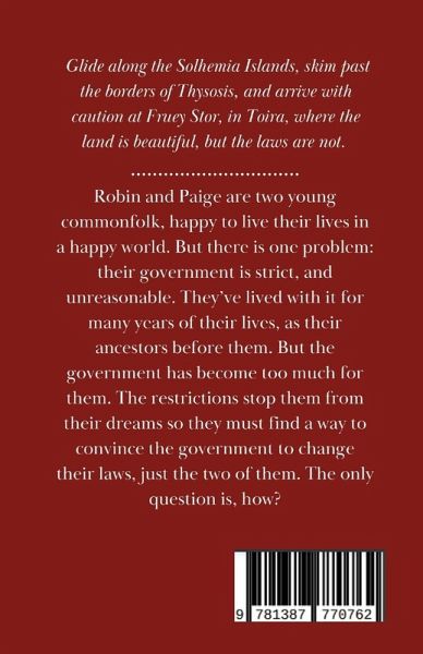 Glide along the Solhemia Islands, skim past the borders of Thysosis, and arrive with caution at Fruey Stor, in Toira, where the land is beautiful, but the laws are not. Robin and Paige are two young commonfolk, happy to live their lives in a happy world. But there is one problem: their government is strict, and unreasonable. They've lived with it for many years of their lives, as their ancestors before them. But the government has become too much for them. The restrictions stop them from their dreams so they must find a way to convince the government to change their laws, just the two of them. The only question is, how?