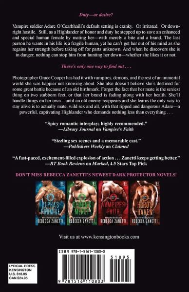 Duty-or desire? Vampire soldier Adare O'Cearbhaill's default setting is cranky. Or irritated. Or down-right hostile. Still, as a Highlander of honor and duty, he stepped up to save an enhanced and special human female by mating her-with merely a bite and a brand. The last person he wants in his life is a fragile human, yet he can't get her out of his mind as she regains her strength before taking off for parts unknown. And when he discovers she is in danger, nothing can stop him from hunting her down-whether she likes it or not. There's only one way to find out . . . Photographer Grace Cooper has had it with vampires, demons, and the rest of an immortal world she was happier not knowing about. She also doesn't believe she's destined for some great battle because of an old birthmark. Forget the fact that her mate is the sexiest thing on two stubborn feet, or that her brand is fading along with her health. She'll handle things on her own-until an old enemy reappears and she learns the only way to stay alive is to actually mate, wild sex and all, with that ripped and dangerous Adare-a powerful, captivating Highlander who demands nothing less than everything . . . "Spicy romantic interplay; highly recommended." -Library Journal on Vampire's Faith "Sizzling sex scenes and a memorable cast." -Publishers Weekly on Claimed "A fast-paced, excitement-filled explosion of action… Zanetti keeps getting better." -RT Book Reviews on Marked, 4.5 Stars Top Pick