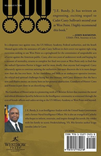 "J.E. Bandy, Jr. has written an engrossing, exciting sequel to Cadet Casey Sullivan's second year at West Point. I highly recommend this book." -John Raymond, USMA 1964, Attorney at Law. In a desperate race against time, the US Military Academy, Federal authorities, and the Israeli Mossad again enlist the assistance of Cadet Casey Sullivan in their covert war against right wing extremists seeking to use West Point as a springboard for the commission of unspeakable acts of terror against the American public. Casey, after two years of undercover work and hoping for a measure of normality, returns to complete her final two-years at West Point only to find that the radical Operation Patriot is bigger and far more deadly than anyone had imagined. Casey reluctantly agrees to continue assisting the authorities, but soon discovers she is in more danger now than she has ever been. As her confidence and skills as an undercover operative increase, the ethical and spiritual challenges facing her also increase, and Casey discovers that she has a new and illusive enemy; an enemy bent on her personal destruction. Guardians of Honor: Cows and Firsties is part three in an electrifying trilogy. The Guardians of Honor series is a pioneering work of Christian fiction that examines the moral and ethical dilemmas faced by believers in the Intelligence community as witnessed through the eyes of female officers and cadets serving at the US Military Academy at West Point and beyond.