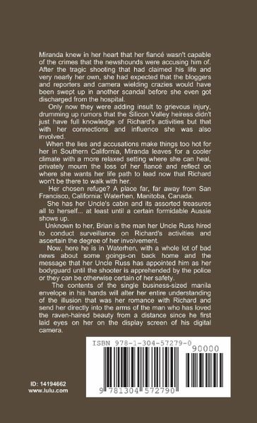 After the tragic shooting that had claimed her fiancé's life and threatened hers, Miranda had expected the world would be interested in another scandal before she even got discharged from the hospital. When the lies and accusations make things too hot in San Francisco, Miranda leaves for a place where she can heal and privately mourn the loss of her fiancé. A place far, far away from California: Waterhen, Manitoba, Canada. She has her Uncle Russ' cabin all to herself... at least until a certain formidable Aussie shows up. Unknown to her, Brian is the man her Uncle Russ hired to conduct surveillance on Richard's activities and ascertain the degree of her involvement. Now, here he is in Waterhen with a whole lot of bad news about some goings-on back home and the message that her Uncle Russ has appointed him as her bodyguard. Will Brian be able to keep Miranda safe from the darkness that means to end her? More than that, can he keep her safe from herself, from the darkness of her heart?