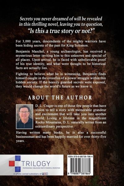 Secrets you never dreamed of will be revealed in this thrilling novel, leaving you to question, "Is this a true story or not?" For 3,000 years, descendants of the mighty warriors have been hiding secrets of the past for King Solomon. Benjamin Maschel, a young archaeologist, has received a mysterious letter inviting him to this unknown and special of all places. Upon arrival, he is faced with unbelievable proof of his true identity, and what were thought to be historical facts are actually lies. Fighting to believe what he is witnessing, Benjamin finds himself caught in the crossfire of a power struggle within this hidden society. If the heavily guarded secrets were exposed, they would change the world's future as we know it.