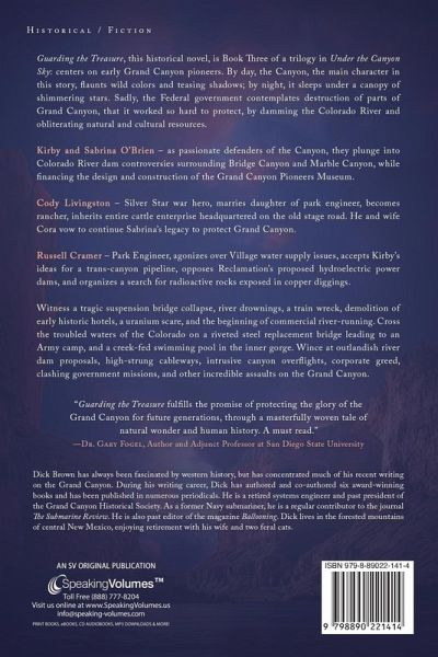 Guarding the Treasure, this historical novel, is Book Three, of a trilogy in Under the Canyon Sky: centers on early Grand Canyon pioneers. By day, the Canyon, the main character in this story, flaunts wild colors and teasing shadows; by night, it sleeps under a canopy of shimmering stars. Sadly, the Federal government contemplates destruction of parts of Grand Canyon, that it worked so hard to protect, by damming the Colorado River and obliterating natural and cultural resources. Kirby and Sabrina O'Brien - as passionate defenders of the Canyon, they plunge into Colorado River dam controversies surrounding Bridge Canyon and Marble Canyon, while financing the design and construction of the Grand Canyon Pioneers Museum. Cody Livingston - Silver Star war hero, marries daughter of park engineer, becomes rancher, inherits entire cattle enterprise headquartered on the old stage road. He and wife Cora vow to continue Sabrina's legacy to protect Grand Canyon. Russell Cramer - Park Engineer, agonizes over Village water supply issues, accepts Kirby's ideas for a trans-canyon pipeline, opposes Reclamation's proposed hydroelectric power dams, and organizes a search for radioactive rocks exposed in copper diggings. Witness a tragic suspension bridge collapse, river drownings, a train wreck, demolition of early historic hotels, a uranium scare, and the beginning of commercial river-running. Cross the troubled waters of the Colorado on a riveted steel replacement bridge leading to an Army camp, and a creek-fed swimming pool in the inner gorge. Wince at outlandish river dam proposals, high-strung cableways, intrusive canyon overflights, corporate greed, clashing government missions, and other incredible assaults on the Grand Canyon. "Guarding the Treasure fulfills the promise of protecting the glory of the Grand Canyon for future generations, through a masterfully woven tale of natural wonder and human history. A must read." -Dr. Gary Fogel, Author and Adjunct Professor at San Diego State University.