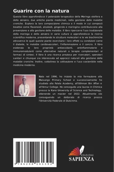Questo libro approfondisce il potenziale terapeutico della Moringa oleifera e dello zenzero, due antiche piante medicinali, nella gestione delle malattie croniche. Esplora la loro composizione chimica e il modo in cui composti bioattivi come flavonoidi, alcaloidi, gingerolo e moringina contribuiscono alla prevenzione e alla gestione delle malattie. Il libro ripercorre l'uso tradizionale della moringa e dello zenzero in varie culture e approfondisce la ricerca scientifica moderna, presentando le strutture molecolari e le vie biochimiche attraverso le quali queste piante esercitano i loro effetti su condizioni come il diabete, le malattie cardiovascolari, l'infiammazione e il cancro. Il libro evidenzia le loro proprietà antiossidanti, antinfiammatorie e immunomodulanti come alternative naturali o terapie complementari ai farmaci di sintesi. Il libro è una risorsa preziosa per ricercatori, operatori sanitari e chiunque sia interessato ad approcci naturali alla gestione delle malattie croniche. Inoltre, sottolinea la coltivazione e l'uso sostenibile nella medicina moderna.
