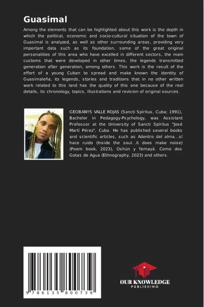 Among the elements that can be highlighted about this work is the depth in which the political, economic and socio-cultural situation of the town of Guasimal is analyzed, as well as other surrounding areas, providing very important data such as its foundation, some of the great original personalities of this area who have excelled in different sectors, the main customs that were developed in other times, the legends transmitted generation after generation, among others. This work is the result of the effort of a young Cuban to spread and make known the identity of Guasimaleña, its legends, stories and traditions that in no other written work related to this land has the quality of this one because of the real details, its chronology, topics, illustrations and revision of original sources.