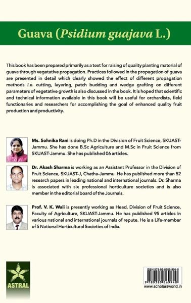 This book has been prepared primarily as a text for raising of quality planting material of guava through vegetative propagation. Practices followed in the propagation of guava are presented in detail which clearly showed the effect of different propagation methods i.e. cutting, layering, patch budding and wedge grafting on different parameters of vegetative growth is also discussed in the book. It is hoped that scientific and technical information available in this book will be useful for orchardists, field functionaries and researchers for accomplishing the goal of enhanced quality fruit production and productivity.