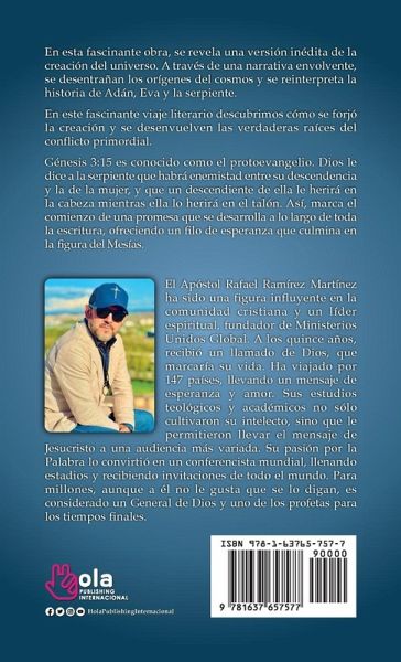 En esta fascinante obra, se revela una versión inédita de la creación del universo. A través de una narrativa envolvente, se desentrañan los orígenes del cosmos y se reinterpreta la historia de Adán, Eva y la serpiente. En este fascinante viaje literario descubrimos cómo se forjó la creación y se desenvuelven las verdaderas raíces del conflicto primordial. Génesis 3:15 es conocido como el protoevangelio. Dios le dice a la serpiente que habrá enemistad entre su descendencia y la de la mujer, y que un descendiente de ella le herirá enla cabeza mientras ella lo herirá en el talón. Así, marca el comienzo de una promesa que se desarrolla a lo largo de toda la escritura, ofreciendo un filo de esperanza que culmina en la figura del Mesías.