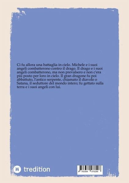 Ci fu allora una battaglia in cielo. Michele e i suoi angeli combatterono contro il drago. Il drago e i suoi angeli combatterono, ma non prevalsero e non c'era più posto per loro in cielo. Il gran dragone fu poi abbattuto, l'antico serpente, chiamato il diavolo o Satana, il seduttore del mondo intero; fu gettato sulla terra e i suoi angeli con lui.