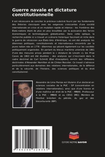 Il est nécessaire de concilier le précieux substrat fourni par les fondements des théories classiques avec les exigences croissantes d'une société internationale en crise et en mutation rapide et intense - les frontières des États-nations étant de plus en plus brouillées par la puissance des forces économiques et technologiques globalisantes. Dans cette optique, la recherche publiée ici a trouvé un scénario historique fascinant et riche dans la guerre de sécession aux États-Unis d'Amérique, où ont été analysés les dilemmes politiques, constitutionnels et internationaux rencontrés par la jeune nation née en 1776 - dilemmes qui pèsent également sur les sociétés politiquement organisées. En partant du blocus maritime unioniste de 1861 (l'une des mesures prises pendant la « dictature de Lincoln »), les Prize Cases de 1863 ont été étudiées - des analyses qui s'inscrivent dans le cadre doctrinal de Carl Schmitt (État d'exception), enrichi des réflexions doctrinales d'Alexander Hamilton et de Clinton Rossiter. Ce travail s'adresse particulièrement aux domaines des relations internationales, de la défense et de la sécurité, de l'histoire, des sciences politiques et du droit constitutionnel.