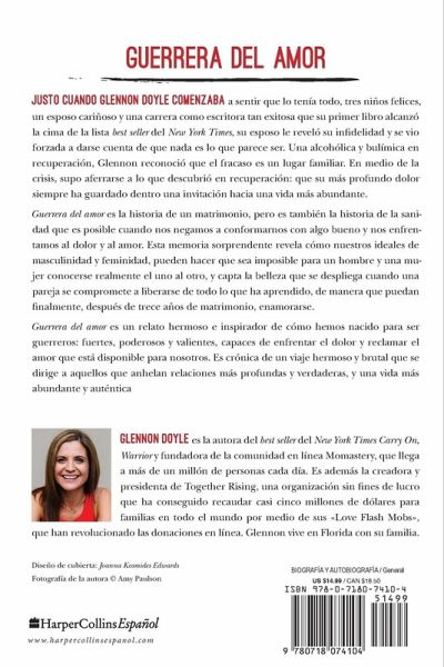 La tan esperada autobiografía por el aclamado autor Glennon Doyle Melton relata la historia de su viaje de autodescubrimiento, tras la implosión de su matrimonio. Justo cuando Glennon Doyle comenzaba a sentir que lo tenía todo, tres niños felices, un esposo cariñoso y una carrera como escritora tan exitosa que su primer libro alcanzó la cima de la lista best seller del New York Times, su esposo le reveló su infidelidad y se vio forzada a darse cuenta de que nada es lo que parece. Una alcohólica y bulímica en recuperación, Glennon reconoció que el fracaso es un lugar familiar. En medio de la crisis, supo aferrarse a lo que descubrió en recuperación: que su más profundo dolor siempre ha guardado dentro una invitación hacia una vida más abundante. Guerrera del amor es la historia de un matrimonio, pero es también la historia de la sanidad que es posible cuando nos negamos a conformarnos con algo bueno y nos enfrentamos al dolor y al amor. Esta memoria sorprendente revela cómo nuestros ideales de masculinidad y feminidad, pueden hacer que sea imposible para un hombre y una mujer conocerse realmente el uno al otro, y capta la belleza que se despliega cuando una pareja se compromete a liberarse de todo lo que ha aprendido, de manera que puedan finalmente, después de trece años de matrimonio, enamorarse. Guerrera del amor es un relato hermoso e inspirador de cómo hemos nacido para ser guerreros: fuertes, poderosos y valientes, capaces de enfrentar el dolor y reclamar el amor que está disponible para nosotros. Es crónica de un viaje hermoso y brutal que se dirige a aquellos que anhelan relaciones más profundas y verdaderas, y una vida más abundante y auténtica. The highly anticipated memoir by bestselling author Glennon Doyle Melton tells the story of her journey of self-discovery after the implosion of her marriage. Love Warrior is the story of one marriage, but it is also the story of the healing that is possible for any of us when we refuse to settle for good enough and begin to face pain and love head-on. This astonishing memoir reveals how our ideals of masculinity and femininity can make it impossible for a man and a woman to truly know one another - and it captures the beauty that unfolds when one couple commits to unlearning everything they've been taught so that they can finally, after thirteen years of marriage, commit to living true?true to themselves and to each other. Love Warrior is a gorgeous and inspiring account of how we are born to be warriors: strong, powerful, and brave; able to confront the pain and claim the love that exists for us all. This chronicle of a beautiful, brutal journey speaks to anyone who yearns for deeper, truer relationships and a more abundant, authentic life.