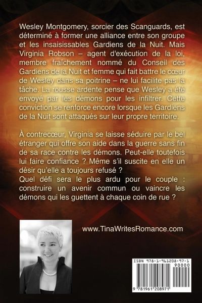 Édition Gros Caractères Wesley Montgomery, sorcier de Scanguards, est déterminé à former une alliance entre son groupe et les insaisissables Gardiens de la Nuit. Mais Virginia Robson - ex-enquêtrice/exécutrice, membre fraîchement nommé du Conseil des Gardiens de la Nuit et femme qui fait battre le cur de Wesley à la chamade - ne lui facilite pas la tâche. La rousse ardente pense que Wesley a été envoyé par les démons pour les infiltrer - une croyance qui est renforcée lorsque les Gardiens de la Nuit sont attaqués dans leur fief. Malgré ses doutes, Virginia est attirée par le beau sorcier qui lui propose son aide dans la guerre sans fin de sa race contre les démons. Mais peut-elle faire confiance à un étranger dont elle ne sait rien, même si son contact enflamme en elle un besoin qu'elle a refusé toute sa vie ? Qu'est-ce qui s'avérera le plus difficile pour le couple : trouver un avenir ensemble ou combattre les démons qui les menacent à chaque tournant ? ¿¿ ¿¿ ¿¿ ¿¿ Lara Adrian, auteure de la série Midnight Breed, vendue dans le New York Times : "Préparez-vous à une chevauchée sauvage ! Les Gardiens de la Nuit sont la seule chose qui se dresse entre l'humanité et une race démoniaque déterminée à dominer le monde. Pour une romance paranormale au rythme effréné et aux enjeux élevés, ne manquez pas d'ajouter Tina Folsom à votre liste de lectures à ne pas manquer !" Gardiens de la Nuit Amant Révélé (#1) Maître Affranchi (#2) Guerrier Bouleversé (#3) Gardien Rebelle (#4) Immortel Dévoilé (#5) Protecteur Sans Égal (#6) Démon Libéré (#7) Les Vampires Scanguards La belle mortelle de Samson (#1) La provocatrice d'Amaury (#2) La partenaire de Gabriel (#3) L'enchantement d'Yvette (#4) La rédemption de Zane (#5) L'éternel amour de Quinn (#6) Les désirs d'Oliver (#7) Le choix de Thomas (#8) Discrète morsure (#8 ¿) L'identité de Cain (#9) Le retour de Luther (#10) La promesse de Blake (#11) Fatidiques Retrouvailles (#11 ¿) L'espoir de John (#12) La tempête de Ryder (#13) La conquête de Damian (#14) Le défi de Grayson (#15) L'amour interdit d'Isabelle (#16) La passion de Cooper (#17) Le courage de Vanessa (#18) Le club des éternels célibataires Séduisant (#1) Attirant (#2) Envoûtant (#3) Torride (#4) Attrayant (#5) Passionné (#6) Hors d'Olympe Une Touche de Grec (#1) Un Parfum de Grec (#2) Un Goût de Grec (#3) Un Souffle de Grec (#4) Les Vampires de Venise Nouvelle 1 : Raphael & Isabella Nouvelle 2 : Dante & Viola Nouvelle 3 : Lorenzo & Bianca Nouvelle 4 : Nico & Oriana Nouvelle 5 : Marcello & Jane Nom de Code Stargate Ace en Fuite (#1) Fox en Vue (#2) Yankee dans le Vent (#3) Tiger à l'Affût (#4) Hawk en Chasse (#5) La Quête du Temps Changement de Sort (#1) Présage du Destin (#2) Thriller Témoin Oculaire La série Stealth Guardians a tout pour plaire : coup de foudre, ennemis devenus amants, rencontre mignonne, héros alpha, compagnons de destin, garde du corps, bande de frères, demoiselle en détresse, femme en péril, identité cachée, invisibilité, âmes surs, héros torturé, écart d'âge, amour de seconde chance, amant en deuil, retour d'entre les morts, bébé secret, enlèvements, amis devenus amants, admirateur secret, dernier à savoir, amour non partagé, amour interdit, partenaires dans la lutte contre la criminalité.