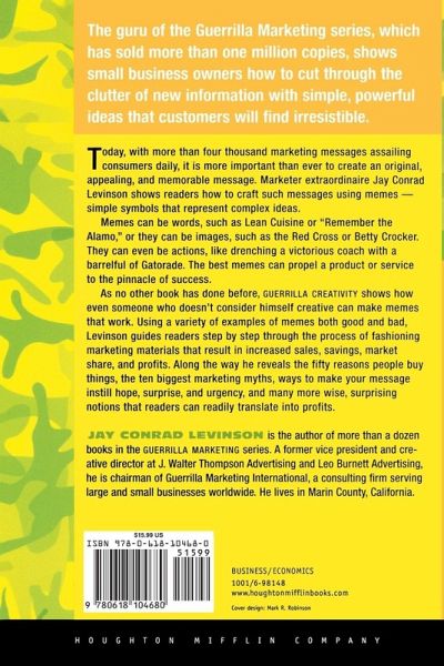 The guru of the Guerrilla Marketing series, which has sold more than one million copies, shows small business owners how to cut through the clutter of new information with simple, powerful ideas that customers will find irresistible. Today, with more than four thousand marketing messages assailing consumers daily, it is more important than ever to create an original, appealing, and memorable message. Marketer extraordinaire Jay Conrad Levinson shows readers how to craft such messages using memes -- simple symbols that represent complex ideas. Memes can be words, such as Lean Cuisine or "Remember the Alamo," or they can be images, such as the Red Cross or Betty Crocker. They can even be actions, like drenching a victorious coach with a barrelful of Gatorade. The best memes can propel a product or service to the pinnacle of success. As no other book has done before, GUERILLA CREATIVITY shows how even someone who doesn't consider himself creative can make memes that work. Using a variety of examples of memes both good and bad, Levinson guides readers step by step through the process of fashioning marketing materials that result in increased sales, savings, market share, and profits. Along the way he reveals the fifty reasons people buy things, the ten biggest marketing myths, ways to make your message instill hope, surprise, and urgency, and many more wise, surprising notions that readers can readily translate into profits.