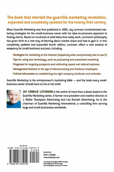 NATIONAL BESTSELLER The book that started the guerilla marketing revolution, expanded and completely updated for the twenty-first century. Jay Levinson's Guerrilla Marketing revolutionized marketing strategies for the small-business owner with his take-no-prisoners approach to finding clients. Based on hundreds of solid and effective ideas, Levinson's philosophy has given birth to a new way of learning about market share and how to gain it. In this completely updated and expanded fourth edition, Levinson offers a new arsenal of weaponry for small-business success including strategies for marketing on the internet (explaining when and precisely how to use it); tips for using new technology, such as podcasting and automated marketing; programs for targeting prospects and cultivating repeat and referral business, and management lessons in the age of telecommuting and freelance employees. Guerrilla Marketing is the entrepreneur's marketing bible?and the book every small-business owner should have on his or her shelf.