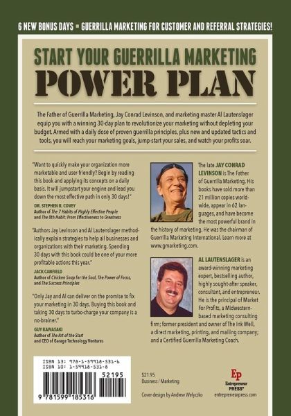 Updated with fresh examples, the latest techniques and trends, new success stories, and fresh, practical marketing habits for today’s aspiring guerrillas, this new edition provides marketers with the latest guerrilla marketing tools and tactics. In just 30 chapters and 30 days, famous marketers Jay Conrad Levinson and Al Lautenslager show eager entrepreneurs how to zero in on their marketing goals and maximize their profits. New marketers learn from updated real-life examples and success stories and proven fundamental concepts, and use daily exercises to take their marketing to the next level ultimately increasing profits, cutting costs, and gaining new customers. Topics detailed in this new edition include proximity marketing, thought leadership, integration of online and offline marketing, speaking and events, direct email, personalization, and implementation. With every step, Levinson and Lautenslager provide thorough action plans to help aspiring guerrillas stay on track, leaving no excuse for anything but success.