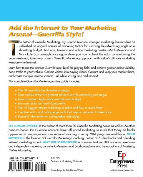 Add the Internet to Your Marketing Arsenal-Guerrilla Style! The Father of Guerrilla Marketing, Jay Conrad Levinson, changed marketing forever when he unleashed his original arsenal of marketing tactics for surviving the advertising jungle on a shoestring budget. And now, Levinson and online marketing masters Mitch Meyerson and Mary Eule Scarborough once again show you how to beat the odds by combining the unconventional, take-no-prisoners Guerrilla Marketing approach with today's ultimate marketing weapon-the Internet. Learn how to use the internet Guerrilla style. Level the playing field, and achieve greater online visibility. Boost traffic to your website. Convert visitors into paying clients. Capture and keep your market share, and create multiple income streams-all while saving time and money! This complete Guerrilla Marketing online guide includes: * The 10 most effective Guerrilla strategies * Case studies of the five greatest online Guerrilla Marketing campaigns * How to create a high-impact website on a budget * Low-cost tactics for maximizing traffic * The 12 biggest internet marketing mistakes and how to avoid them * Creative tactics and cutting-edge tools that inspire customers to take action * Essential information on cutting-edge technology