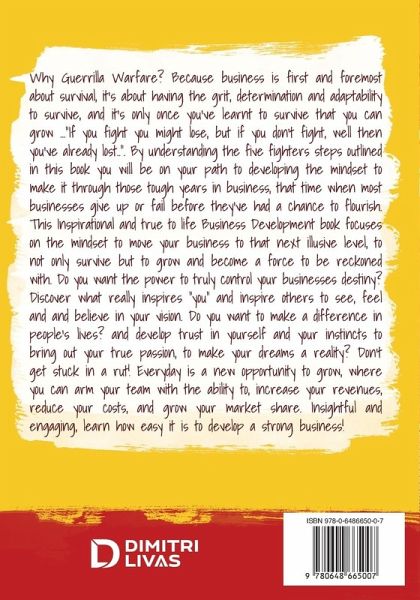 Why Guerrilla Warfare? Because business is first and foremost about survival, it's about having the grit, determination and adaptability to survive, and it's only once you've learnt to survive that you can grow ..."If you fight you might lose, but if you don't fight, well then you've already lost..". By understanding the five fighters steps outlined in this book you will be on your path to developing the mindset to make it through those tough years in business, that time when most businesses give up or fail before they've had a chance to flourish. This Inspirational and true to life Business Development book focuses on the mindset to move your business to that next illusive level, to not only survive but to grow and become a force to be reckoned with. Do you want the power to truly control your businesses destiny? Discover what really inspires "you" and inspire others to see, feel and and believe in your vision. Do you want to make a difference in people's lives? and develop trust in yourself and your instincts to bring out your true passion, to make your dreams a reality? Don't get stuck in a rut! Everyday is a new opportunity to grow, where you can arm your team with the ability to, increase your revenues, reduce your costs, and grow your market share. Insightful and engaging, learn how easy it is to develop a strong business!