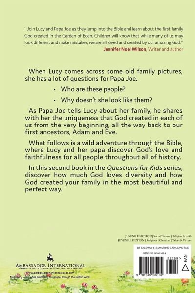 When Lucy comes across some old family pictures, she has a lot of questions for Papa Joe. * Who are these people? * Why doesn't she look like them? As Papa Joe tells Lucy about her family, he shares with her the uniqueness that God created in each of us from the very beginning, all the way back to our first ancestors, Adam and Eve. What follows is a wild adventure through the Bible, where Lucy and her papa discover God's love and faithfulness for all people throughout all of history. In this second book in the Questions for Kids series, discover how much God loves diversity and how God created your family in the most beautiful and perfect way. What Others Are Saying... Karen weaves into this book the story of creation and the important message that even though we may have different skin colors or look different, we all come from the first family, Adam and Eve. In this day and age when racial tensions run high at times, this is a very needed message for our children to hear. I highly recommend Guess Who Is in God's Family! Kris Cox, Educational Consultant, speaker, and author Guess Who Is in God's Family is a beautifully written exchange between Lucy and her Papa Joe as he answers Lucy's questions about her family members who came before. Karen Ferguson captures the hearts of our young readers and brings light to God's love for each one of His children. If you have children or grandchildren, this is a beautiful story with a valuable message of love! Leslie Colburn, Author and founder of Cross My Heart Books In Guess Who Is in God's Family, Lucy and her grandpa go on a Bible adventure to the Garden of Eden to discover where the very first family began. The story accurately depicts how sin entered the world, but also foreshadows God's master plan to redeem mankind. Kids will love reading this book as well as the first and will look forward to new adventures with Lucy and her grandpa in the future. Sandra Kay Chambers, Author of Fingerprint Devotions: 40 Devotions to Help You Realize You Are a Kid Uniquely Created by God for a Purpose Guess Who Is in God's Family uncovers how it all began with the first family and the bite that changed everything. This book and the ones to come will be such useful tools in laying a foundation of truth for our children who, like Lucy, have so many questions! Kelsie Detweiler, Children's book author and founder of Books for Little Disciples Guess Who Is in God's Family is an engaging, gospel-centered picture book that is a must-have for home, school, and church libraries! Kayla E. Green, Award-winning Christian author and educator Join Lucy and Papa Joe as they jump into the Bible and learn about the first family God created in the Garden of Eden. Children will know that while many of us may look different and make mistakes, we are all loved and created by our amazing God. Jennifer Noel Wilson, Writer and author of The Best Trophy Guess Who Is in God's Family is the second in an adorable series of beautifully illustrated picture books. It teaches essential biblical truth in language that young children can easily understand. Utilizing creative storytelling, the author teaches children that we are all related-created by a God whose love is never-changing, never-failing, and never-ending. The included vocabulary and discussion questions are a delightful bonus. Kelly Wilson Mize, Writer and author of The Beautiful Story Within Me