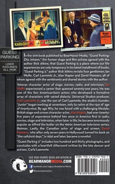 In the 2011 book published by BearManor Media, "Guest Parking: Zita Johann," the former stage and film actress agreed with the author Rick Atkins, that Guest Parking is a place where our life experiences are only temporary. In his latest installment of books, "Guest Parking 2," author Rick Atkins revisits four gentlemen, Ian Wolfe, Carl Laemmle Jr., Alan Napier and David Manners, all of whom agreed with the sentiments and shared stories with the author. Veteran character actor of stage, movies, radio, and television, Ian Wolfe experienced a career that spanned seventy-one years. He was one of the few American-born actors who developed a formative array of characters with varied dialects. Universal Studios producer, Carl Laemmle Jr., was the son of Carl Laemmle, the studio’s founder. "Junior" began working at seventeen, only to retire at the ripe ol’ age of twenty-nine. By age fifty, he was faced with a challenging lifestyle. British stage and screen character actor, Alan Napier, had over twenty-five years of experience behind him once in America first in radio, movies, stage and television, when later in life, he became enormously popular as Alfred the butler on the 1960s American television series, Batman. Lastly, the Canadian actor of stage and screen, David Manners, who after only seven years in Hollywood turned his back on "the celluloid days," in 1936 and later, became a novelist. "Guest Parking 2" includes two hundred and thirty photographs, and concludes with a heartfelt Afterword written by the late dancer and actress, Carla Laemmle.