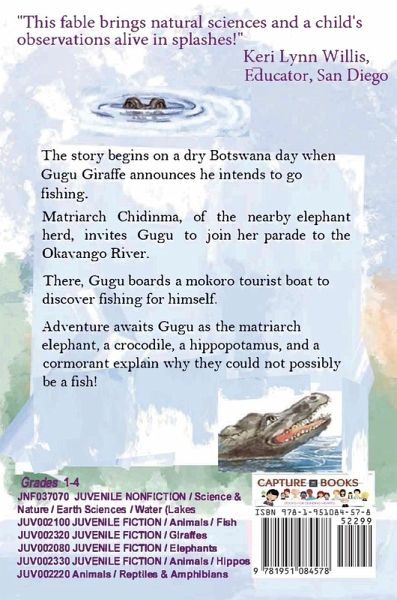 A highly recommended complement for the animal biology, plant life, weather, water, and geography curriculum in K-3rd grade. This story splashes in observations of the Okavango Delta and fable-styled animal interactions in the river channel through fine storytelling and artwork. It all begins on a dry Botswana day when young Gugu, a giraffe, announces he wants to go fishing. Specifically, Gugu wants to know, "What is a fish?" Matriarch Chidinma of the nearby elephant herd allows Gugu to join her parade lumbering to the Okavango River. There, Gugu can board a mokoro tourist boat to see about fishing. Adventure awaits Gugu as the matriarch elephant, a crocodile, a hippopotamus, and a cormorant explain why they could not possibly be a fish! Reference guide with book questions are included for teachers and student resources.le, a hippopotamus, and a cormorant explain why they could not possibly be a fish!