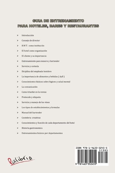 El arte de servir a los demás nos ayuda a conocer el mundo de otra manera".40 años de experiencia en servicio al cliente interno y externo, tanto en mi país República Dominicana como en la ciudad de Nueva York y Nueva Jersey en Estados Unidos. Este libro servirá de gran aporte al conocimiento de aquellos que deseen convertirse en servidores profesionales brindando así un excelente servicio hasta a los clientes más exigentes. Un bartender debe de tener amplios conocimientos prácticos y teóricos de coctelerías, licores y en general de todo cuanto concierne a su labor profesional. El camarero profesional es una persona con características excepcionales, sus cualidades deben ser numerosas, además de necesitar una buena salud física, mental y emocional. Ser un camarero profesional requiere experiencia pero más que eso requiere un alto grado de relaciones humanas, disciplina, responsabilidad y entusiasmo. El conocimiento incompleto de sus responsabilidades puede resultar en un servicio deficiente.