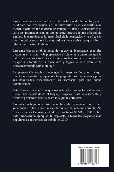Una entrevista es una parte clave de la búsqueda de empleo, y un candidato con experiencia en las entrevistas es el candidato más probable para recibir la oferta de trabajo. Si bien el currículum y la carta de presentación son los componentes básicos de una solicitud de empleo, la entrevista es la etapa final de la evaluación y le ofrece la oportunidad de mostrar a los empleadores que usted es más que solo su educación e historial laboral. Una entrevista no es el momento de ver qué tan bien puede responder preguntas en el acto, y la preparación es clave para garantizar que la entrevista sea un éxito. Este es el momento de convencer al empleador de que sus fortalezas, calificaciones y logros lo convierten en la persona adecuada para el trabajo. La preparación implica investigar la organización y el trabajo, planificar respuestas apropiadas a las preguntas más frecuentes y pulir sus habilidades, especialmente las necesarias para una buena comunicación. Este libro explica todo lo que necesita saber sobre las entrevistas. Cubre cada detalle desde el lenguaje corporal hasta la vestimenta y desde la primera entrevista hasta la segunda entrevista. También incluye una lista completa de preguntas junto con sugerencias sobre cómo responderlas de la manera correcta. Se discuten varias técnicas, incluidos los métodos STAR y CAR. Sobre todo, proporciona ejemplos de respuestas a todas las preguntas más populares de entrevistas de trabajo en 2019.