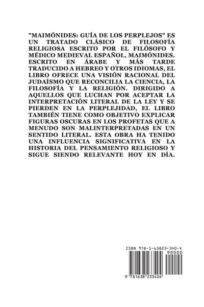 "Maimónides: Guía de los Perplejos" es un tratado clásico de filosofía religiosa escrito por el filósofo y médico medieval español, Maimónides. Escrito en árabe y más tarde traducido a hebreo y otros idiomas, el libro ofrece una visión racional del Judaísmo que reconcilia la ciencia, la filosofía y la religión. Dirigido a aquellos que luchan por aceptar la interpretación literal de la ley y se pierden en la perplejidad, el libro también tiene como objetivo explicar figuras oscuras en los profetas que a menudo son malinterpretadas en un sentido literal. Esta obra ha tenido una influencia significativa en la historia del pensamiento religioso y sigue siendo relevante hoy en día.