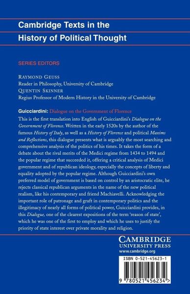 This is the first English translation of Guicciardini's Dialogue on the Government of Florence, written in the 1520s. Rejecting classical republican arguments in the name of the new political realism, it argues for the priority of state interest over private morality and religion.