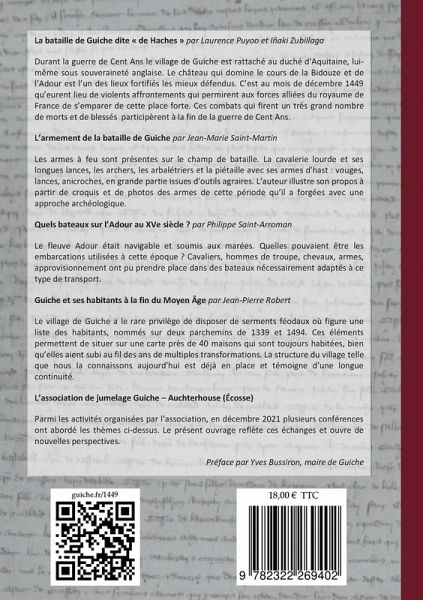 Guiche, village médiéval où se côtoient Basques et Gascons, est une place forte défendue par un imposant château fort qui surplombe la rivière Bidouze. C'est en 1449 qu'a lieu la bataille dite de "Haches" qui participe à la fin de la guerre de Cent Ans. Les auteurs retracent cet épisode autour de plusieurs thèmes : quelles étaient les forces en présence, comme s'est déroulée la prises du château, quelles pouvaient être les armes utilisées et quels bateaux naviguaient sur l'Adour pour convoyer les troupes et les équipements ? En complément, et sur la base de deux serments féodaux où figure la liste des habitants, les lieux ou maisons toujours habités sont positionnés sur une carte.