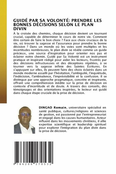 À la croisée des chemins, chaque décision devient un tournant crucial, capable de déterminer le cours de notre vie. Comment être certain de faire le bon choix ? Face aux choix cruciaux de la vie, où trouver la sagesse et l'assurance pour prendre la bonne décision ? Dans un monde où les voies sont multiples et les incertitudes nombreuses, le plan divin se révèle comme un guide précieux, une source d'inspiration pour orienter nos pas et éclairer notre chemin. Guidé par Sa Volonté est un instrument pratique et inspirant rédigé pour aider les lecteurs, frustrés par des décisions infructueuses et des déceptions répétées, à se tourner vers la sagesse infinie des Saintes Écritures. En s'appuyant sur elles, ils peuvent faire des choix éclairés dans un monde moderne assailli par l'hésitation, l'ambiguïté, l'inquiétude, l'indécision, l'ambivalence, l'imprévisibilité et la confusion. Il se distingue par une approche pragmatique, concrète et inspirante, offrant une compréhension inédite sur la prise de décision en contexte d'incertitude et de doute. A travers des conseils, des témoignages et des orientations inspirées, le lecteur est guidé dans chaque étape cruciale de la prise de décision.