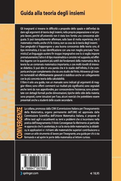 Il libro vuole aiutare a studiare la teoria degli insiemi indicando l'articolazione della teoria, a partire dal concetto di infinito per arrivare alla definizione dei numeri, sia finiti sia infiniti, con la diramazione tra ordinali e cardinali; insiste sulle proprietà degli insiemi numerabili, e sul continuo. Non sostituisce un manuale, perché non ci sono tutte le dimostrazioni ma solo alcune, considerate importanti, che danno il gusto dello stile di questa materia.