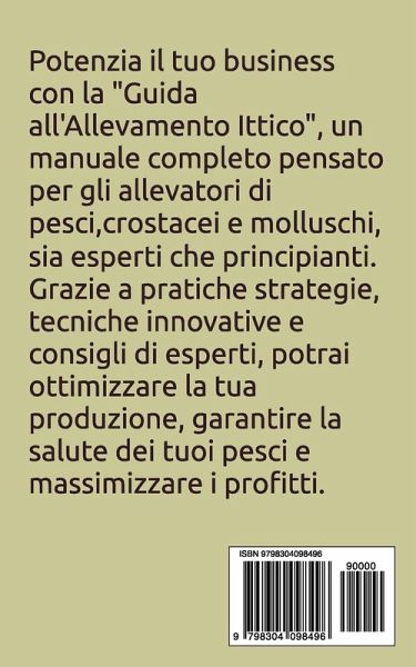 Potenzia il tuo business con la "Guida all'Allevamento Ittico", un manuale completo pensato per gli allevatori di pesci, crostacei e molluschi, sia esperti che principianti. Grazie a pratiche strategie, tecniche innovative e consigli di esperti, potrai ottimizzare la tua produzione, garantire la salute dei tuoi pesci e massimizzare i profitti. Trasforma la tua passione in un progetto vincente e sostenibile nel mondo dell'acquacoltura!