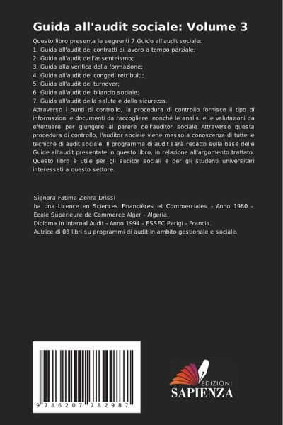 Questo libro presenta le seguenti 7 Guide all'audit sociale:1. Guida all'audit dei contratti di lavoro a tempo parziale;2. Guida all'audit dell'assenteismo;3. Guida alla verifica della formazione;4. Guida all'audit dei congedi retribuiti;5. Guida all'audit del turnover;6. Guida all'audit del bilancio sociale;7. Guida all'audit della salute e della sicurezza.Attraverso i punti di controllo, la procedura di controllo fornisce il tipo di informazioni e documenti da raccogliere, nonché le analisi e le valutazioni da effettuare per giungere al parere dell'auditor sociale. Attraverso questa procedura di controllo, l'auditor sociale viene messo a conoscenza di tutte le tecniche di audit sociale. Il programma di audit sarà redatto sulla base delle Guide all'audit presentate in questo libro, in relazione all'argomento trattato. Questo libro è utile per gli auditor sociali e per gli studenti universitari interessati a questo settore.