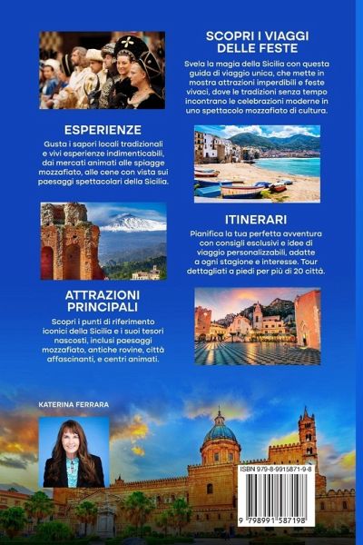 Scopri la Magia delle Tradizioni, delle Feste e dei Tesori Nascosti della Sicilia A differenza di altre guide di viaggio, La Guida Completa a Feste e Viaggi Sicilia ti porta direttamente nel cuore pulsante dell'isola: le sue incredibili feste. Immergiti nelle ricche tradizioni, celebrazioni vivaci ed esperienze autentiche che danno vita a ogni città siciliana. Da questi momenti indimenticabili, parti alla scoperta dei monumenti iconici, dei paesaggi mozzafiato e della rinomata cucina siciliana. Questa non è una semplice guida: è la chiave per vivere la Sicilia nella sua forma più vivace e memorabile. Scopri il Fascino Incomparabile della Sicilia Tesoro del Mediterraneo ricco di storia, cultura e panorami straordinari, questa guida è il tuo passaporto per le esperienze più incredibili dell'isola. Dalle feste vivaci alle meraviglie naturali, passando per la deliziosa cucina siciliana e l'architettura barocca mozzafiato. Che tu stia pianificando una fuga estiva o un'avventura fuori stagione, questa guida offre consigli di viaggio esperti e raccomandazioni sui periodi migliori per visitare la Sicilia, aiutandoti ad esplorarla al suo massimo splendore. Immergiti nelle Tradizioni Autentiche della Sicilia Scopri avventure uniche lontano dai soliti itinerari. Naviga verso isole vulcaniche come Stromboli e Lipari, dove la bellezza naturale si fonde con meraviglie geologiche. Esplora le Saline di Trapani, dove le antiche tradizioni di raccolta del sale incontrano uno scenario costiero mozzafiato. Assisti ad uno spettacolo indimenticabile al Teatro Greco di Siracusa, dove storia e cultura si intrecciano. Gusta i sapori locali nei vivaci mercati e nei ristoranti a gestione familiare, immergendoti nella vera essenza della cucina siciliana. Vivi le Feste Vivaci della Sicilia Dall'Infiorata di Noto, famosa in tutto il mondo, alla spirituale Festa di Santa Lucia a Siracusa, le feste siciliane riflettono la ricchezza artistica e culturale dell'isola. Partecipa al Palermo Jazz Fest o al prestigioso Festival Taormina Arte, che celebrano musica, arte e cultura. Esplora oltre 150 feste e sagre, che mettono in mostra tradizioni, specialità stagionali e lo spirito di comunità dell'isola. Vivi il colorato Carnevale di Acireale, celebre per i suoi carri allegorici e le parate festose. Scopri la Sagra del Vino di San Martino a Castelbuono, una celebrazione di vini locali e delizie siciliane. Dalle feste meno affollate, come la Madonna delle Milizie a Scicli, alle processioni intense della Festa di Sant'Agata a Catania, questa guida ti garantisce un accesso unico ai migliori eventi della Sicilia. Esplora Monumenti Iconici e Tesori Nascosti Visita città storiche come Palermo, Trapani e Messina, ognuna delle quali offre uno sguardo unico sulla storia, la cultura e le tradizioni della Sicilia. Ammira la magnificenza vulcanica dell'Etna e la bellezza costiera delle Isole Eolie. Passeggia tra rovine antiche, villaggi medievali e meraviglie naturali, dalla maestosa Valle dei Templi di Agrigento all'architettura barocca di Noto e Ragusa. Rilassati su spiagge idilliache, dalle coste sabbiose ai gioielli nascosti come Cala Rossa a Favignana oppure la Spiaggia dei Conigli a Lampedusa, per trovare il perfetto equilibrio tra avventura e tranquillità.