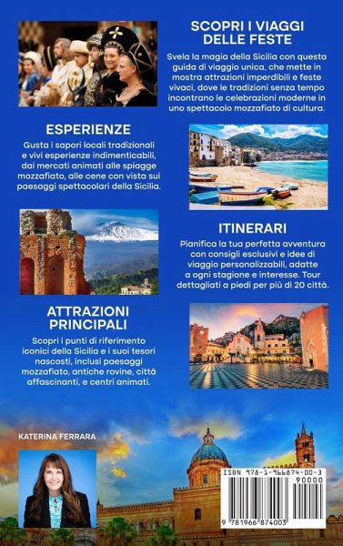 Scopri la Magia delle Tradizioni, delle Feste e dei Tesori Nascosti della Sicilia A differenza di altre guide di viaggio, La Guida Completa a Feste e Viaggi Sicilia ti porta direttamente nel cuore pulsante dell'isola: le sue incredibili feste. Immergiti nelle ricche tradizioni, celebrazioni vivaci ed esperienze autentiche che danno vita a ogni città siciliana. Da questi momenti indimenticabili, parti alla scoperta dei monumenti iconici, dei paesaggi mozzafiato e della rinomata cucina siciliana. Questa non è una semplice guida: è la chiave per vivere la Sicilia nella sua forma più vivace e memorabile. Scopri il Fascino Incomparabile della Sicilia Tesoro del Mediterraneo ricco di storia, cultura e panorami straordinari, questa guida è il tuo passaporto per le esperienze più incredibili dell'isola. Dalle feste vivaci alle meraviglie naturali, passando per la deliziosa cucina siciliana e l'architettura barocca mozzafiato. Che tu stia pianificando una fuga estiva o un'avventura fuori stagione, questa guida offre consigli di viaggio esperti e raccomandazioni sui periodi migliori per visitare la Sicilia, aiutandoti ad esplorarla al suo massimo splendore. Immergiti nelle Tradizioni Autentiche della Sicilia Scopri avventure uniche lontano dai soliti itinerari. Naviga verso isole vulcaniche come Stromboli e Lipari, dove la bellezza naturale si fonde con meraviglie geologiche. Esplora le Saline di Trapani, dove le antiche tradizioni di raccolta del sale incontrano uno scenario costiero mozzafiato. Assisti ad uno spettacolo indimenticabile al Teatro Greco di Siracusa, dove storia e cultura si intrecciano. Gusta i sapori locali nei vivaci mercati e nei ristoranti a gestione familiare, immergendoti nella vera essenza della cucina siciliana. Vivi le Feste Vivaci della Sicilia Dall'Infiorata di Noto, famosa in tutto il mondo, alla spirituale Festa di Santa Lucia a Siracusa, le feste siciliane riflettono la ricchezza artistica e culturale dell'isola. Partecipa al Palermo Jazz Fest o al prestigioso Festival Taormina Arte, che celebrano musica, arte e cultura. Esplora oltre 150 feste e sagre, che mettono in mostra tradizioni, specialità stagionali e lo spirito di comunità dell'isola. Vivi il colorato Carnevale di Acireale, celebre per i suoi carri allegorici e le parate festose. Scopri la Sagra del Vino di San Martino a Castelbuono, una celebrazione di vini locali e delizie siciliane. Dalle feste meno affollate, come la Madonna delle Milizie a Scicli, alle processioni intense della Festa di Sant'Agata a Catania, questa guida ti garantisce un accesso unico ai migliori eventi della Sicilia. Esplora Monumenti Iconici e Tesori Nascosti Visita città storiche come Palermo, Trapani e Messina, ognuna delle quali offre uno sguardo unico sulla storia, la cultura e le tradizioni della Sicilia. Ammira la magnificenza vulcanica dell'Etna e la bellezza costiera delle Isole Eolie. Passeggia tra rovine antiche, villaggi medievali e meraviglie naturali, dalla maestosa Valle dei Templi di Agrigento all'architettura barocca di Noto e Ragusa. Rilassati su spiagge idilliache, dalle coste sabbiose ai gioielli nascosti come Cala Rossa a Favignana oppure la Spiaggia dei Conigli a Lampedusa, per trovare il perfetto equilibrio tra avventura e tranquillità.