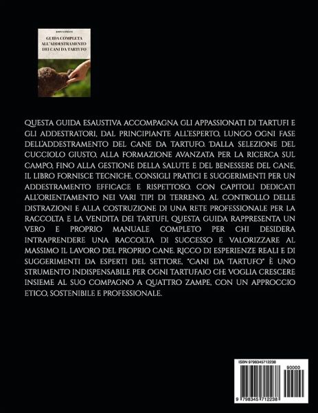 Questa guida esaustiva accompagna gli appassionati di tartufi e gli addestratori, dal principiante all'esperto, lungo ogni fase dell'addestramento del cane da tartufo. Dalla selezione del cucciolo giusto, alla formazione avanzata per la ricerca sul campo, fino alla gestione della salute e del benessere del cane, il libro fornisce tecniche, consigli pratici e suggerimenti per un addestramento efficace e rispettoso. Con capitoli dedicati all'orientamento nei vari tipi di terreno, al controllo delle distrazioni e alla costruzione di una rete professionale per la raccolta e la vendita dei tartufi, questa guida rappresenta un vero e proprio manuale completo per chi desidera intraprendere una raccolta di successo e valorizzare al massimo il lavoro del proprio cane. Ricco di esperienze reali e di suggerimenti da esperti del settore, "GUIDA COMPLETA ALL'ADDESTRAMENTO DEI CANI DA TARTUFO" è uno strumento indispensabile per ogni tartufaio che voglia crescere insieme al suo compagno a quattro zampe, con un approccio etico, sostenibile e professionale. 4o