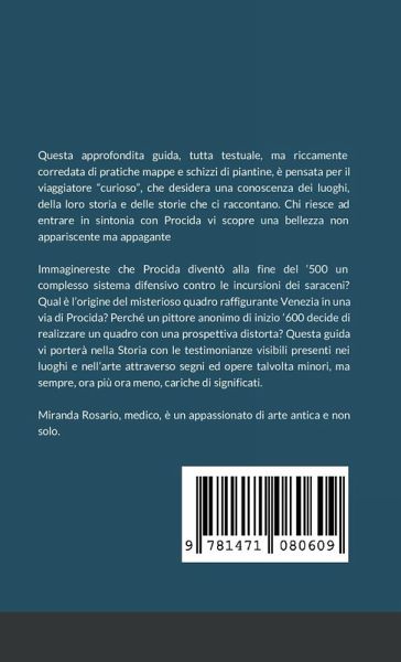 Questa approfondita guida, tutta testuale, ma riccamente corredata di pratiche mappe e piantine, è pensata per il viaggiatore "curioso", che desidera una conoscenza dei luoghi, della loro storia e delle storie che ci raccontano. Chi riesce ad entrare in sintonia con Procida vi scopre una bellezza non appariscente ma appagante Immaginereste che Procida diventò alla fine del '500 un complesso sistema difensivo contro le incursioni dei saraceni? Qual è l'origine del misterioso quadro raffigurante Venezia in una via di Procida? Perché un pittore anonimo di inizio '600 decide di realizzare un quadro con una prospettiva distorta? Questa guida vi porterà nella Storia con le testimonianze visibili presenti nei luoghi e nell'arte attraverso segni ed opere talvolta minori, ma sempre, ora più ora meno, cariche di significati