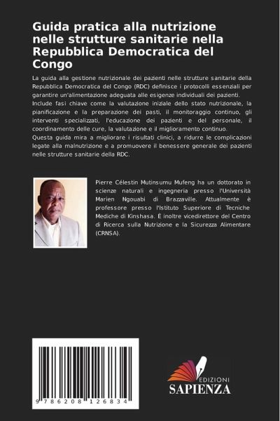 La guida alla gestione nutrizionale dei pazienti nelle strutture sanitarie della Repubblica Democratica del Congo (RDC) definisce i protocolli essenziali per garantire un'alimentazione adeguata alle esigenze individuali dei pazienti. Include fasi chiave come la valutazione iniziale dello stato nutrizionale, la pianificazione e la preparazione dei pasti, il monitoraggio continuo, gli interventi specializzati, l'educazione dei pazienti e del personale, il coordinamento delle cure, la valutazione e il miglioramento continuo. Questa guida mira a migliorare i risultati clinici, a ridurre le complicazioni legate alla malnutrizione e a promuovere il benessere generale dei pazienti nelle strutture sanitarie della RDC.