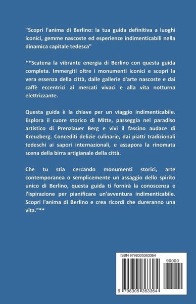 Berlino. Una città di contraddizioni. Una sinfonia di storia e modernità. Un parco giochi per artisti, un rifugio per sognatori e una calamita per chi cerca lo straordinario. Questa non è solo un'altra guida turistica. Questo è il tuo invito a scoprire l'anima di Berlino, ad andare oltre i sentieri battuti e scoprire una città che pulsa di un'energia unica. In queste pagine troverai: Tesori nascosti: scopri bar segreti, gallerie fuori dai sentieri battuti e ritrovi locali che solo gli addetti ai lavori conoscono. Approfondimenti locali: ottieni prospettive autentiche dagli stessi berlinesi, offrendo una comprensione più profonda della vivace cultura della città. Oltre la guida: vai oltre il tipico itinerario turistico e vivi Berlino come un vero locale, dal goderti un picnic in un parco nascosto al ballare tutta la notte in un leggendario club techno. Una festa per i sensi: concediti avventure culinarie, dai piatti tradizionali tedeschi allo street food innovativo e alla fiorente scena della birra artigianale della città. Un viaggio nel tempo: esplora il passato turbolento della città in toccanti monumenti commemorativi e immergiti nella vivace scena artistica che prospera in questa dinamica metropoli. >Berlino ti aspetta. Sei pronto a svelarne l'anima? Acquista la tua copia oggi e intraprendi uno straordinario viaggio attraverso la dinamica capitale della Germania.
