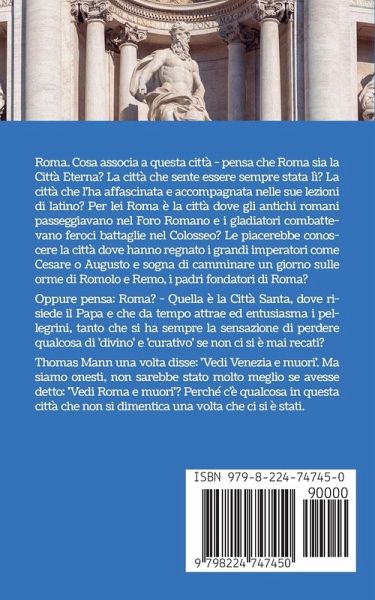 Roma. Cosa associa a questa città - pensa che Roma sia la Città Eterna? La città che sente essere sempre stata lì? La città che l'ha affascinata e accompagnata nelle sue lezioni di latino? Per lei Roma è la città dove gli antichi romani passeggiavano nel Foro Romano e i gladiatori combattevano feroci battaglie nel Colosseo? Le piacerebbe conoscere la città dove hanno regnato i grandi imperatori come Cesare o Augusto e sogna di camminare un giorno sulle orme di Romolo e Remo, i padri fondatori di Roma? Oppure pensa: Roma? - Quella è la Città Santa, dove risiede il Papa e che da tempo attrae ed entusiasma i pellegrini, tanto che si ha sempre la sensazione di perdere qualcosa di 'divino' e 'curativo' se non ci si è mai recati? Thomas Mann una volta disse: 'Vedi Venezia e muori'. Ma siamo onesti, non sarebbe stato molto meglio se avesse detto: 'Vedi Roma e muori'? Perché c'è qualcosa in questa città che non si dimentica una volta che ci si è stati.