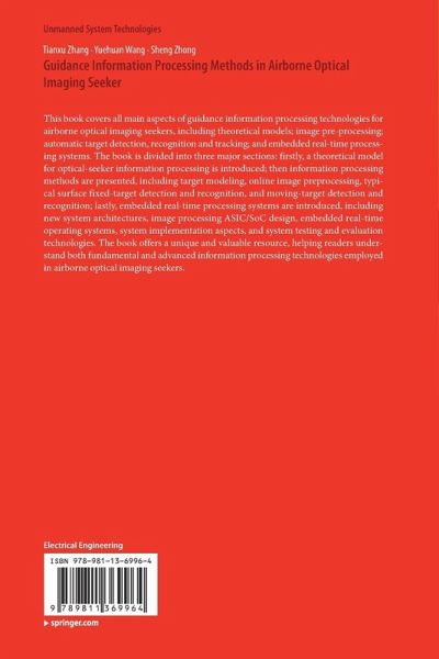 This book covers all main aspects of guidance information processing technologies for airborne optical imaging seekers, including theoretical models; image pre-processing; automatic target detection, recognition and tracking; and embedded real-time processing systems. The book is divided into three major sections: firstly, a theoretical model for optical-seeker information processing is introduced; then information processing methods are presented, including target modeling, online image pre-processing, typical surface fixed-target detection and recognition, and moving-target detection and recognition; lastly, embedded real-time processing systems are introduced, including new system architectures, image processing ASIC/SoC design, embedded real-time operating systems, system implementation aspects, and system testing and evaluation technologies. The book offers a unique and valuable resource, helping readers understand both fundamental and advanced information processing technologiesemployed in airborne optical imaging seekers.