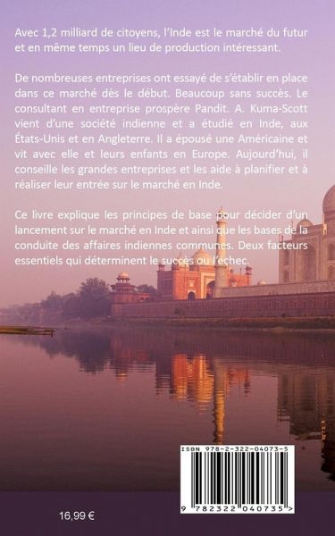 Avec 1,2 milliard de citoyens, l'Inde est le marché du futur et en même temps un lieu de production intéressant.De nombreuses entreprises ont essayé de s'établir en place dans ce marché dès le début. Beaucoup sans succès. Le consultant en entreprise prospère Pandit. A. Kuma-Scott vient d'une société indienne et a étudié en Inde, aux États-Unis et en Angleterre. Il a épousé une Américaine et vit avec elle et leurs enfants en Europe. Aujourd'hui, il conseille les grandes entreprises et les aide à planifier et à réaliser leur entrée sur le marché en Inde.Ce livre explique les principes de base pour décider d'un lancement sur le marché en Inde et ainsi que les bases de la conduite des affaires indiennes communes. Deux facteurs essentiels qui déterminent le succès ou l'échec.