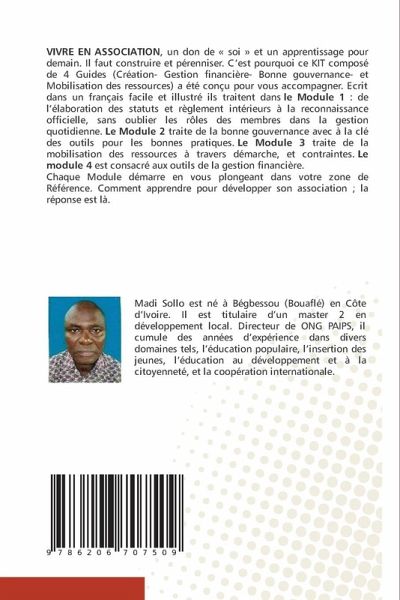 VIVRE EN ASSOCIATION, un don de « soi » et un apprentissage pour demain. Il faut construire et pérenniser. C'est pourquoi ce KIT composé de 4 Guides (Création- Gestion financière- Bonne gouvernance- et Mobilisation des ressources) a été conçu pour vous accompagner. Ecrit dans un français facile et illustré ils traitent dans le Module 1 : de l'élaboration des statuts et règlement intérieurs à la reconnaissance officielle, sans oublier les rôles des membres dans la gestion quotidienne. Le Module 2 traite de la bonne gouvernance avec à la clé des outils pour les bonnes pratiques. Le Module 3 traite de la mobilisation des ressources à travers démarche, et contraintes. Le module 4 est consacré aux outils de la gestion financière. Chaque Module démarre en vous plongeant dans votre zone de Référence. Comment apprendre pour développer son association ; la réponse est là.
