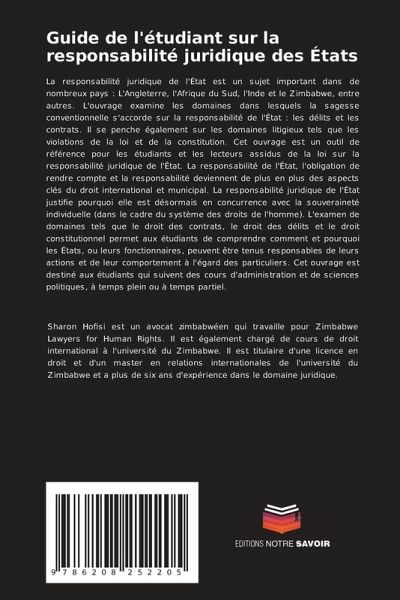 La responsabilité juridique de l'État est un sujet important dans de nombreux pays : L'Angleterre, l'Afrique du Sud, l'Inde et le Zimbabwe, entre autres. L'ouvrage examine les domaines dans lesquels la sagesse conventionnelle s'accorde sur la responsabilité de l'État : les délits et les contrats. Il se penche également sur les domaines litigieux tels que les violations de la loi et de la constitution. Cet ouvrage est un outil de référence pour les étudiants et les lecteurs assidus de la loi sur la responsabilité juridique de l'État. La responsabilité de l'État, l'obligation de rendre compte et la responsabilité deviennent de plus en plus des aspects clés du droit international et municipal. La responsabilité juridique de l'État justifie pourquoi elle est désormais en concurrence avec la souveraineté individuelle (dans le cadre du système des droits de l'homme). L'examen de domaines tels que le droit des contrats, le droit des délits et le droit constitutionnel permet aux étudiants de comprendre comment et pourquoi les États, ou leurs fonctionnaires, peuvent être tenus responsables de leurs actions et de leur comportement à l'égard des particuliers. Cet ouvrage est destiné aux étudiants qui suivent des cours d'administration et de sciences politiques, à temps plein ou à temps partiel.