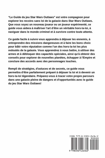 "Le Guide du jeu Star Wars Outlaws" est votre compagnon pour explorer les recoins sans loi de la galaxie dans Star Wars Outlaws. Que vous soyez un nouveau joueur ou un joueur expérimenté, ce guide vous aidera à maîtriser l'art d'être un véritable hors-la-loi, à naviguer dans le monde criminel et à survivre contre toute attente. Ce guide facile à suivre vous apprendra à déjouer les ennemis, à entreprendre des missions dangereuses et à faire les bons choix pour bâtir votre réputation comme l'un des hors-la-loi les plus redoutés de la galaxie. Vous apprendrez à vous battre, à utiliser des armes et à débloquer des capacités spéciales, ainsi qu'à obtenir des conseils pour explorer de nouvelles planètes, échapper à l'Empire et conclure des accords avec des personnages louches. Rempli de stratégies, d'astuces et de secrets, ce guide vous permettra d'être parfaitement préparé à déjouer la loi et à devenir un hors-la-loi légendaire. Préparez-vous à tracer votre propre parcours dans une galaxie pleine de dangers et d'opportunités avec le guide du jeu Star Wars Outlaws!