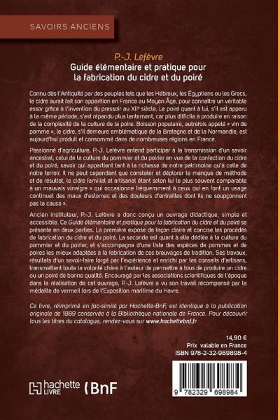 Guide élémentaire pour la fabrication du cidre et du poiré. Date de l'édition originale: 1889 Connu dès l'Antiquité par des peuples tels que les Hébreux, les Égyptiens ou les Grecs, le cidre aurait fait son apparition en France au Moyen Âge, pour connaître un véritable essor grâce à l'invention du pressoir au XIIe siècle. Le poiré quant à lui, s'il est apparu à la même période, s'est répandu plus lentement, car plus diffi cile à produire en raison de la complexité de la culture de la poire. Boisson populaire, autrefois appelé « vin de pomme ', le cidre, s'il demeure emblématique de la Bretagne et de la Normandie, est aujourd'hui produit et consommé dans de nombreuses régions en France. Passionné d'agriculture, P.-J. Lefèvre entend participer à la transmission d'un savoir ancestral, celui de la culture du pommier et du poirier en vue de la confection du cidre et du poiré, savoir qui appartient tant à la richesse de notre patrimoine qu'à celle de notre terroir. Il ne peut cependant que constater et déplorer le manque de méthode et de résultat, le cidre familial et artisanal étant selon lui le plus souvent comparable à un mauvais vinaigre « qui occasionne fréquemment à ceux qui en font un usage continuel des maux d'estomac et des douleurs d'entrailles dont ils ne soupçonnent pas la cause '. Ancien instituteur, P.-J. Lefèvre a donc conçu un ouvrage didactique, simple et accessible. Ce Guide élémentaire et pratique pour la fabrication du cidre et du poiré se présente en deux parties. La première expose de façon claire et concise les procédés de fabrication du cidre et du poiré. La seconde est quant à elle dédiée à la culture du pommier et du poirier, et s'accompagne d'une liste des espèces de pommes et de poires les mieux adaptées à la fabrication de ces breuvages de tradition. Ses travaux, résultats d'un savoir-faire forgé par l'expérience et enrichi par les conseils d'artisans, transmettent toute la volonté chère à l'auteur de permettre à tous de produire un cidre ou un poiré de bonne qualité. Encouragé par les associations scientifiques de l'époque dans la réalisation de cet ouvrage, P.-J. Lefèvre a vu son travail récompensé par la médaille de vermeil lors de l'Exposition maritime du Havre. Ce livre, réimprimé en fac-similé par Hachette-BnF, est identique à la publication originale de 1889 conservée à la Bibliothèque nationale de France. Pour découvrir tous les titres du catalogue, rendez-vous sur www.hachettebnf.fr.